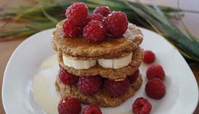 Pancakes abwechselnd mit Bananen und Himbeeren stapeln und zum Schluss mit etwas Agavendicksaft übergießen. |
