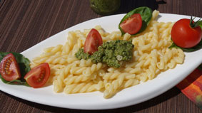15-18g Basilikumblätter60g Pinienkerne1 große Knoblauchzehe1/2 TL Meersalz1/2 TL Zitronensaft2 EL Olivenöl