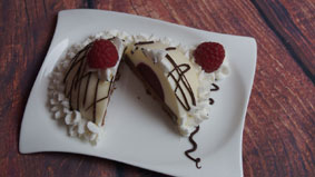 400ml Milch 1 P. Vanillepuddingpulver 5 EL Zucker 2 P. gemahlene Gelatine 100ml Eierlikör 1 B. Sahne Zutaten Fruchtkern: 65g Beeren 1 Blatt Gelatine 15g Zucker 6 kleine runde Schoko-Biskuitböden in der Größe der Form Zur Deko: Zartbitterschokolade Himbeeren Sahne | Gelatine für einige Minuten in kaltes Wasser quellen lassen. Die Beeren mit dem Zucker vermischen und in der Mikrowelle oder auch auf dem Herd in einem Topf erwärmen, dann das Beeren-Zucker-Gemisch pürieren, als nächstes die Gelatine ausdrücken und unter die Beere-Zuckermischung rühren bis es geschmolzen ist. Nun kann die Mischung in die Förmchen gefüllt werden. Die Form erst für 1 Stunde in den Kühlschrank stellen und dann für mind. 3 Stunden in den Gefrierschrank. WICHTIG: Der Fruchtkern muss komplett durchgefroren sein zur Weiterverarbeitung. Zubereitung Eierlikör-Vanille-Mousse: Die Milch mit dem Zucker und dem Puddingpulver gut verrühren. Auf dem Herd kurz aufkochen lassen bis der Pudding dick wird. Die Gelatine laut Packungsanleitung anrühren. Den Pudding etwas abkühlen lassen. Den Eierlikör dazu rühren. Die aufgequollene Gelatine dazu geben und so lange rühren bis sie sich aufgelöst hat. Auskühlen lassen und in den Kühlschrank stellen. Wenn die Masse anfängt fest zu werden, die geschlagene Sahne unterheben. Die größere Silikon-Backform etwa ¾ mit der Mousse füllen, einen gefrorenen Fruchtkern in die Mitte setzen, etwas eindrücken und zum Abschluss kommt noch der Biskuitboden oben drauf, der auch noch etwas in die Form gedrückt wird. Das Ganze kommt dann über Nacht in den Gefrierschrank. Mousse-Törtchen aus der Form lösen, auf einen Teller stürzen und mit geschmolzener Schokolade, Sahne und Himbeeren dekorieren. Vor dem Servieren 1 Stunde auftauen lassen. Man benötige 1 x Silikon-Backform, mit 6 Halbkugel in der Form, bei mir hatte eine Halbkugel einen Durchmesser von 8,5 cm und dann benötigt man noch für den Fruchtkern eine Silikon-Backform mit kleineren Halbkugeln, da hatten meine Halbkugeln einen Durchmesser von 4 cm. Man könnte dafür jedoch auch eine leere Toffifee-Packung nehmen. |