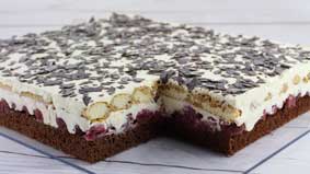 | 200g Butter 200g Blockschokolade 6 Eier 200g Zucker 2 P. Vanillezucker 200g Mehl 2 EL Kakaopulver 2 1/2 TL Backpulver Espresso-Mischung: 300ml Espresso (frisch gebrüht) 8 EL Mokkalikör (z. B. "Kahlúa"; oder Kaffeesirup; z. B. von Monin) Belag: 2 Gläser Kirschen 250g Kirschkonfitüre 8 Blätter weiße Gelatine 500g Sahne 700g Vanillejoghurt 500g Mascarpone 250g Löffelbiskuit Deko: Schokoraspeln | Den Backofen auf 160°C Umluft (180°C Ober-/Unterhitze) vorheizen. Butter und zerbröckelte Blockschokolade in einer kleinen Metallschüssel in der Mikrowelle oder über einem heißen Wasserbad schmelzen lassen. Eier, Zucker und Vanillezucker in der Küchenmaschine/Handrührer mind. 5 Minuten hell und cremig aufschlagen. Flüssige Butter-Schokoladen-Mischung unterrühren. Mehl, Kakao und Backpulver mischen, über die Eicreme sieben und mit einem Schneebesen kurz unterrühren. Teig in eine mit Backpapier ausgelegte quadratische Backrahmen/Springform (ca. 23x23 cm) auf mittlerer Schiene ca. 15-20 Minuten backen. Espresso-Mischung: Espresso abkühlen lassen und mit dem Mokka-Likör mischen. Den abgekühlten Tortenboden aus der Form lösen und mit der weichen Oberseite nach unten auf eine Platte legen. Backrahmen/Springformrand um den Kuchen legen. Den Teigboden mit etwa 4-5 EL von der Espresso-Likör-Mischung beträufeln. Zubereitung Belag: Kirschen abtropfen lassen und mit der Konfitüre verrühren. Kirschmischung auf dem Teigboden verteilen. Die Gelatineblätter in kaltem Wasser ca. 5 Minuten einweichen. Sahne steif schlagen und kaltstellen. Gelatine ausdrücken und in der Mikrowelle kurz erwärmen und auflösen oder in einem kleinen Topf bei kleiner Hitze unter Rühren auflösen. 4-5 EL Joghurt unter die Gelatine rühren. Restlichen Joghurt und Mascarpone verrühren, dann die Gelatinemischung langsam unterrühren. Wenn alles glatt verrührt ist, die Sahne unterheben. Etwa ⅓ der Joghurtcreme auf die Kirschen streichen. Löffelbiskuits dicht an dicht auf die Creme legen und mit der restlichen Espresso-Mischung beträufeln. Restliche Creme auf den Biskuits verstreichen und die Torte für mind. 4 Stunden, besser über Nacht, abgedeckt in den Kühlschrank stellen. Schokoraspeln über die Torte streuen. |
