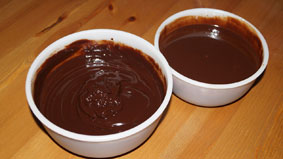| Schokolade in Rippen brechen, Sahne aufkochen und über die Schokolade gießen, ca. 5 Min. stehen lassen, dann mit einem Schneebesen vorsichtig verrühren, bis es eine Homogenemasse gibt.