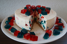 Creme: Für die Creme die restliche Gelatine in kaltem Wasser einweichen und in etwas warmen Wasser auflösen. Den Joghurt mit dem Frischkäse, dem Puderzucker, Vanillezucker und Zitronensaft verrühren. Die Sahne steif schlagen und unterheben. Nun die Gelatine mit der Joghurt-Frischkäsemasse temperieren und dazu geben. Die Geleewürfel unter die Creme heben und auf den Tortenboden füllen. Glatt streichen und am besten über Nacht fest werden lassen.