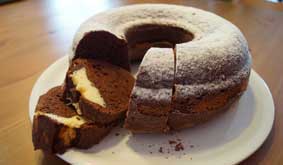 150g Zartbitter-Schokolade | Backofen auf 150°C Umluft (175°C Ober-/Unterhitze) vorheizen. Schokolade hacken und über einem warmen Wasserbad schmelzen. Butter, 250g Zucker und Vanillin-Zucker cremig rühren und dann 4 Eier nacheinander unterrühren. Mehl und Backpulver mischen und abwechselnd mit 75ml Milch unterrühren. Schokolade und Kakao unterrühren. Zubereitung Cheesecakefüllung: 4 Eier und 150g Zucker cremig rühren und dann Frischkäse und Stärke unterrühren. 2/3 des Schokoladenteiges in eine gefettete, mit Mehl ausgestäubte große Savarinform (26cm Ø; 2,75 Liter Inhalt) füllen. Teig am Rand etwas hoch streichen, in die Vertiefung die Käsemasse gießen (persönliche Erfahrungen haben mir gezeigt, dass es sinnvoller ist, die Käsemasse in einen Spritzbeutel zu füllen und dann den Kuchen damit zu befüllen). Übrigen Teig mit 25 ml Milch verrühren und vorsichtig auf der Käsemasse verteilen. Kuchen auf mittlerer Schiene ca. 60 Min. backen, herausnehmen und auf einem Kuchengitter abkühlen lassen. Noch lauwarm auf eine Tortenplatte stürzen und auskühlen lassen. Mit Puderzucker bestäuben. |