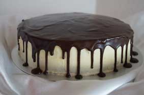 Alle Zutaten über dem Wasserbad oder in der Mikrowelle schmelzen lassen, etwas abkühlen lassen und dann zügig von der Mitte heraus über den Kuchen verteilen, der Kuchen sollte bis kurz davor im Kühlschrank stehen. |
