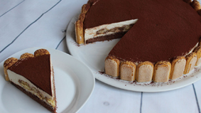 | 2 Eier 75 g Zucker 1 P. Vanillinzucker Pr. Salz 75 g Mehl 1/2 TL Backpulver 1 TL Speisestärke 2 EL Backkakao Zum Tränken: 2 TL Backkakao 2 TL Zucker 100 ml Milch 75 ml starker Espresso oder Kaffee 2 TL Amaretto Für die Creme: 500 g Mascarpone 75 g Zucker 2 TL Amaretto 250 g Sahne 1 P. Sahnesteif Sonstige Zutaten: 200 g Löffelbiskuit Backkakao zum Bestreuen | Backofen auf 160°C Umluft (180°C Ober-/Unterhitze) vorheizen. Eier mit einer Küchenmaschine/Handrührgerät schaumig schlagen. Zucker, Vanillinzucker und eine Prise Salz dazugeben und gut mixen, bis sich der Zucker aufgelöst hat. Mehl, Backpulver, Stärke und Kakao gut miteinander vermengen und nach und nach unter die Eier-Zuckermasse geben. Den Teig in eine mit Backpapier ausgelegte 24 cm große Springform verteilen, glattstreichen und in ca. 15 Minuten im vorgeheizten Ofen backen. Den Boden kurz abkühlen lassen, aus der Form lösen und vollständig abkühlen lassen. Zubereitung Tränke: Milch, Kakao und Zucker unterrühren aufkochen lassen, vom Herd nehmen und Kaffee und Amaretto einrühren. Den Biskuitboden auf eine Tortenplatte setzen und mit der Hälfte der Tränke beträufeln. Zubereitung Creme: Mascarpone, Zucker und Amaretto verrühren. Sahne mit Sahnesteif steif schlagen und unterheben. ⅓ der Creme auf dem Boden verstreichen, mit der Hälfte der Löffelbiskuits belegen und mit der restlichen Tränke beträufeln. Die Torte mit der restlichen Creme bestreichen (auch um den Rand), die restlichen Löffelbiskuits halbieren und rundherum um die Torte stellen. Dabei die Biskuits behutsam andrücken. Die Torte dann bis zum Servieren kaltstellen. Kurz vor dem Verzehr die Torte mit Backkakao bestäuben. |