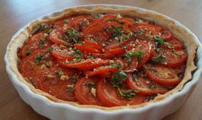 Backofen auf 175°C Umluft (190°C Ober-/Unterhitze) vorheizen. Inzwischen die saure Sahne mit fein abgeriebener Zitronenschale, Zitronensaft, Salz und Pfeffer verrühren. Tomaten waschen und in ca. 1/2 cm dicke Scheiben schneiden. Die gefettete Tarteform mit dem Teig auskleiden. Teigboden mehrmals mit der Gabel einstechen und ca. 10 Minuten vorbacken. Danach Form etwas abkühlen lassen. Den Boden nun mit der saure Sahne Masse ausstreichen und mit den fein gehackten Walnusskernen bestreuen. Darauf die Tomatenscheiben dachziegelartig verteilen. Zum Schluss die Tarte mit dem Balsamico-Essig und dem Öl beträufeln und im vorgeheizten Backofen bei 175°C Umluft (190°C Ober-/Unterhitze) ca. 20-25 Minuten backen. Tarte mit Oregano oder Basilikum Blättchen und gehackten Walnüssen bestreut servieren. |