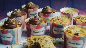 Die abgekühlten Muffins mit der Schokocreme bespritzen und mit den restlichen gehackten Walnusskernen bestreuen.